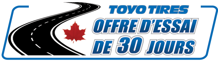 Achetez 4 pneus TOYO admissibles et profitez d’un « essai de 30 jours ». Si au cours de cette période vous n’êtes pas entièrement satisfait de la performance de vos pneus TOYO, retournez- les et obtenez un remboursement intégral.